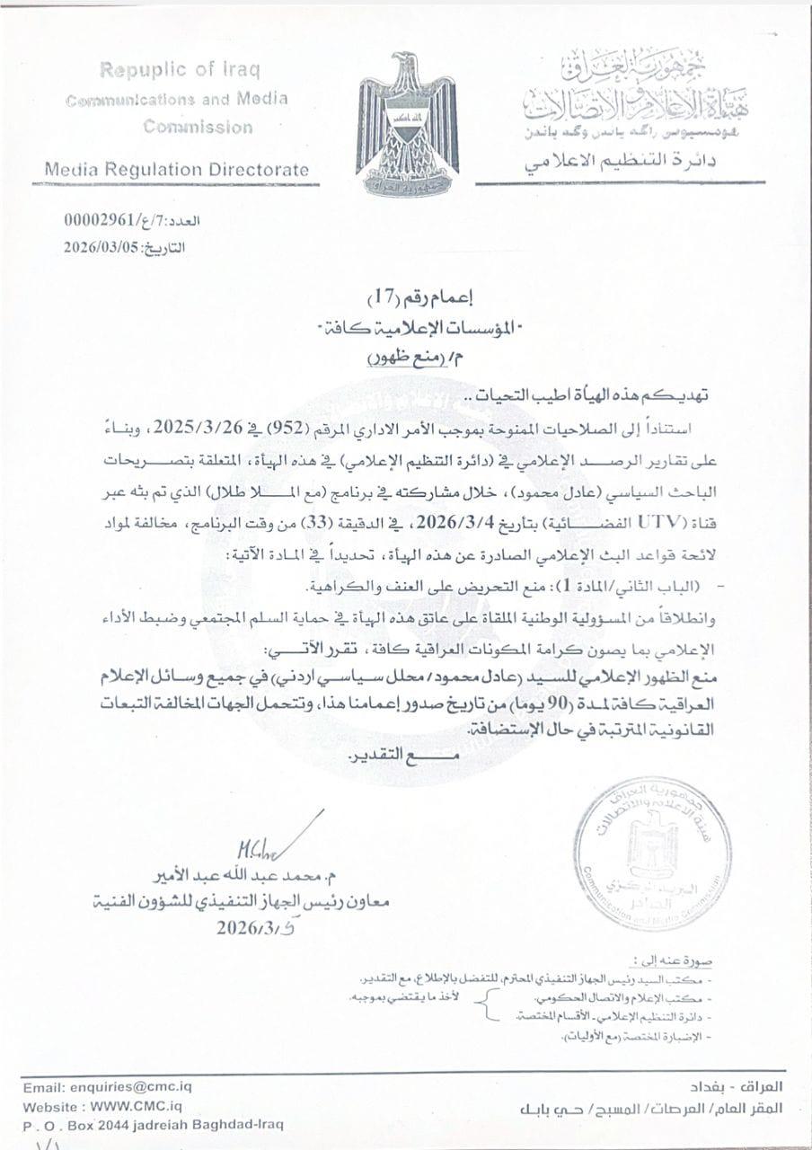 الرئيسية/سياسة وأمن وإقتصاد/هيئة الإعلام والإتصالات تقرر منع الظهور الإعلامي للمحلل السياسي الأردني (عادل محمود) في جميع وسائل الاعلام لمدة 90 يوماً هيئة الإعلام والإتصالات تقرر منع الظهور الإعلامي للمحلل السياسي الأردني (عادل محمود) في جميع وسائل الاعلام لمدة 90 يوماً منذ ساعتينآخر تحديث: 2026/03/05 فيسبوك X لينكدإن Tumblr بينتيريست Reddit VKontakte Odnoklassniki Pocket سكايب ماسنجر ماسنجر واتساب تيلقرام ڤايبر لاين مشاركة عبر البريد طباعة منذ ساعتينآخر تحديث: 2026/03/05 فيسبوك X لينكدإن Tumblr بينتيريست Reddit VKontakte Odnoklassniki Pocket سكايب ماسنجر ماسنجر واتساب تيلقرام ڤايبر لاين مشاركة عبر البريد طباعة شاركها فيسبوك X لينكدإن Tumblr بينتيريست Reddit VKontakte Odnoklassniki Pocket سكايب ماسنجر ماسنجر واتساب تيلقرام ڤايبر لاين مشاركة عبر البريد طباعة